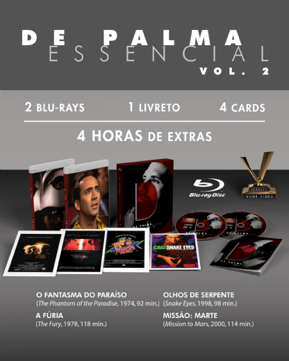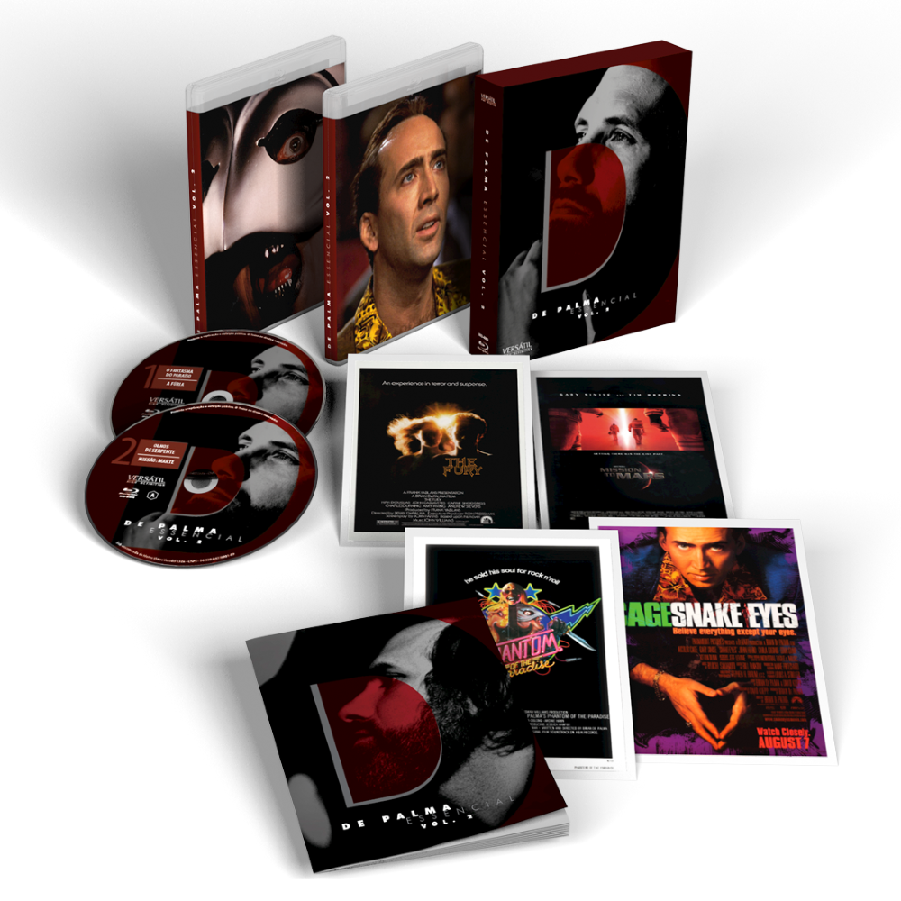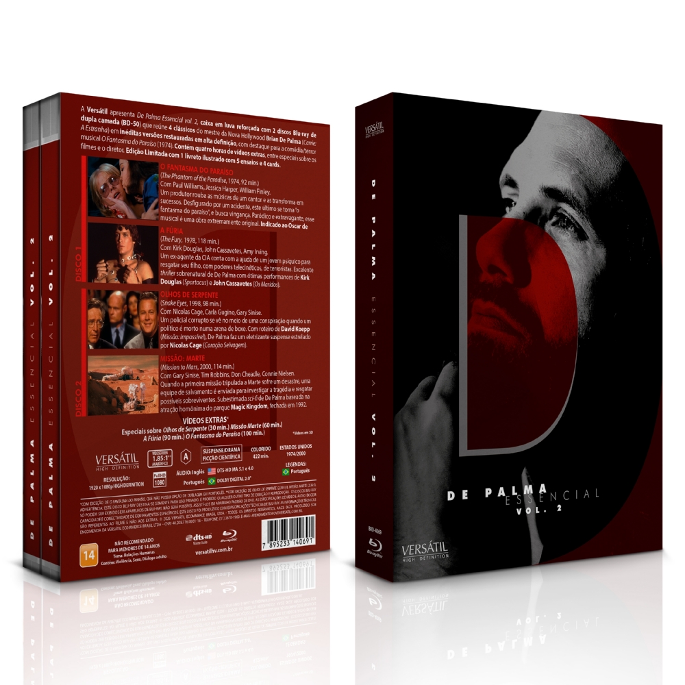 A Versátil apresenta DE PALMA ESSENCIAL vol. 2, caixa em luva reforçada com 2 discos Blu-ray de dupla camada (BD-50) que reúne 4 clássicos do mestre da Nova Hollywood Brian De Palma (“Carrie: A Estranha”) em inéditas versões restauradas em alta definição, com destaque para a comédia/terror musical “O Fantasma do Paraíso” (1974). Contém quatro horas de vídeos extras, entre especiais sobre os filmes e o diretor. Edição Limitada com 1 livreto ilustrado com 5 ensaios e 4 cards.