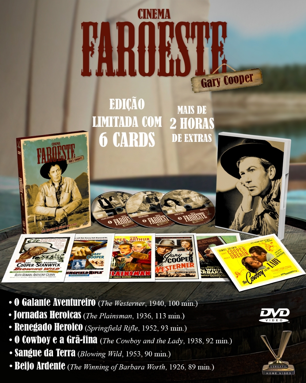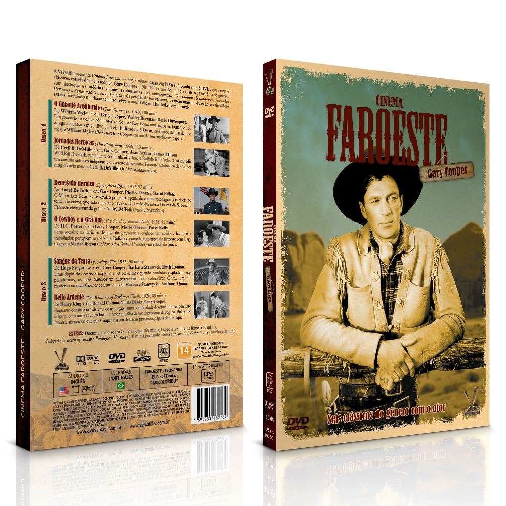 A Versátil apresenta CINEMA FAROESTE: GARY COOPER, caixa em luva reforçada com 3 DVDs que reúne 6 faroestes estrelados pelo icônico Gary Cooper (1901-1961), um dos maiores astros da história do gênero, com destaque para as inéditas versões restauradas dos clássicos “O Galante Aventureiro”, “Jornadas Heroicas” e “Renegado Heroico”, além de três pérolas de sua carreira, inéditas em DVD no Brasil: “O Cowboy e a Grã-fina”, “Sangue da Terra” e “Beijo Ardente”. Na direção, mestres como William Wyler (“Os Melhores Anos de Nossas Vidas”), Cecil B. DeMille (“Sansão e Dalila”), André De Toth (“A Quadrilha Maldita”), Hugo Fregonese (“Flechas da Vingança”) e Henry King (“O Matador”). Contém mais de duas horas de vídeos extras, incluindo um documentário sobre o ator. Edição Limitada com 6 cards.