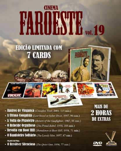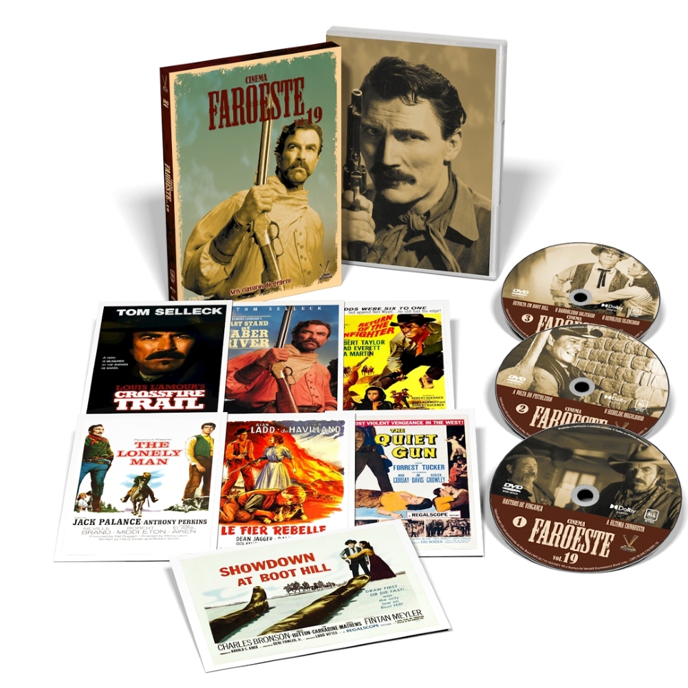 A Versátil apresenta CINEMA FAROESTE vol. 19, caixa em luva reforçada com 3 DVDs que reúne 6 inéditos clássicos do gênero no formato, com destaque para os excelentes westerns contemporâneos “A Última Conquista” (1997) e “Rastros de Vingança” (2001), ambos com Tom Selleck (“Magnum”), e para “A Volta do Pistoleiro” (1966), com o astro Robert Taylor (“O Caminho do Diabo”). Contém mais de duas horas de extras, incluindo um sétimo filme: “O REVÓLVER SILENCIOSO (“The Quiet Gun”, 1957), pérola do gênero com Lee Van Cleef (“O Dia da Desforra”) em início de carreira. Edição Limitada com 7 cards.