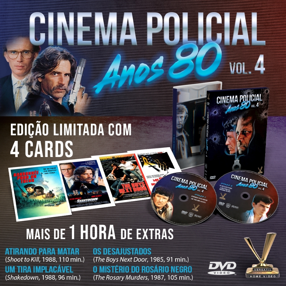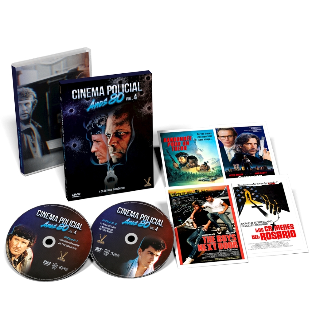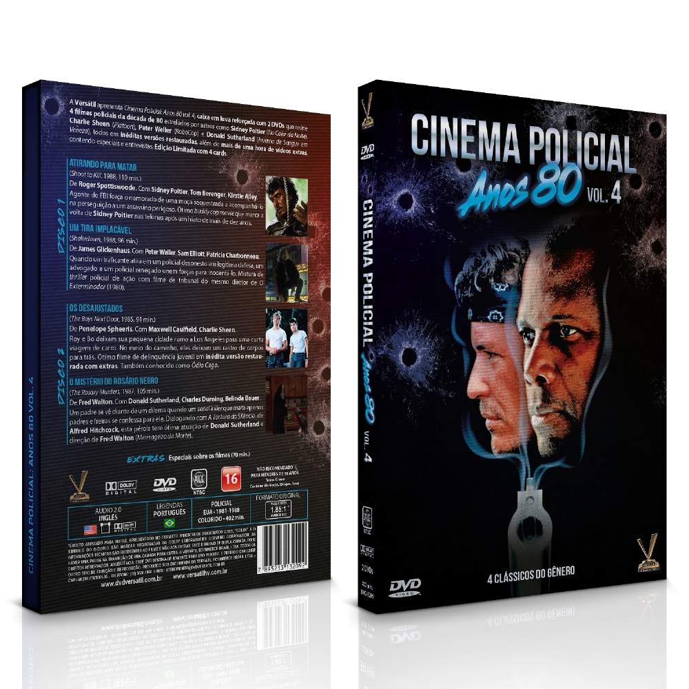 A Versátil apresenta CINEMA POLICIAL: ANOS 80 vol. 4, caixa em luva reforçada com 2 DVDs que reúne 4 filmes policiais da década de 80 estrelados por astros como Sidney Poitier (“No Calor da Noite”), Charlie Sheen (“Platoon”), Peter Weller (“RoboCop”) e Donald Sutherland (“Inverno de Sangue em Veneza”), todos em inéditas versões restauradas, além de mais de uma hora de vídeos extras, contendo especiais e entrevistas. Edição Limitada com 4 cards.