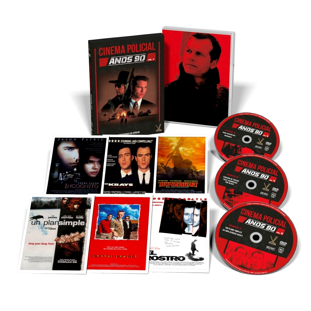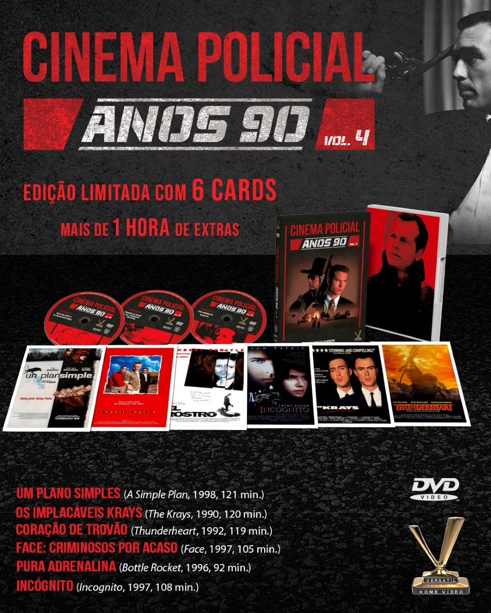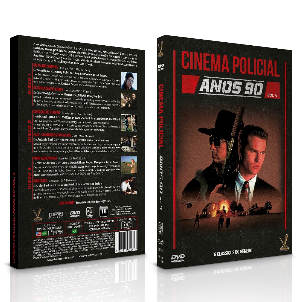 A Versátil apresenta CINEMA POLICIAL: ANOS 90 VOL. 4, caixa em luva reforçada com 3 DVDs que reúne 6 clássicos filmes policiais da década de 1990, incluindo a versão restaurada e com opção de dublagem de “Um Plano Simples” (1998), de Sam Raimi (“Uma Noite Alucinante”, “O Homem-Aranha”), e o inédito “Pura Adrenalina” (1996), estreia de Wes Anderson (“Moonrise Kingdom”, “O Grande Hotel Budapeste”) na direção. Mais de uma hora de extras, incluindo documentários e especiais sobre o cineasta e os filmes. Edição Limitada com 6 cards.