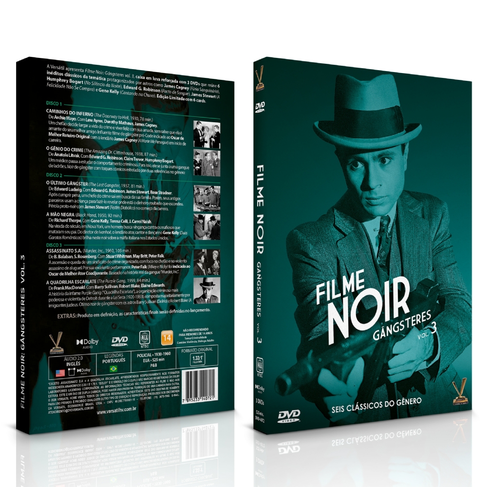A Versátil apresenta FILME NOIR: GÂNGSTERES vol. 3, caixa em luva reforçada com 3 DVDs que reúne 6 inéditos clássicos da temática protagonizados por astros como James Cagney (“Fúria Sanguinária”), Humphrey Bogart (“No Silêncio da Noite”), Edward G. Robinson (“Pacto de Sangue”), James Stewart (“A Felicidade Não Se Compra”) e Gene Kelly (“Cantando na Chuva”). Edição Limitada com 6 cards.