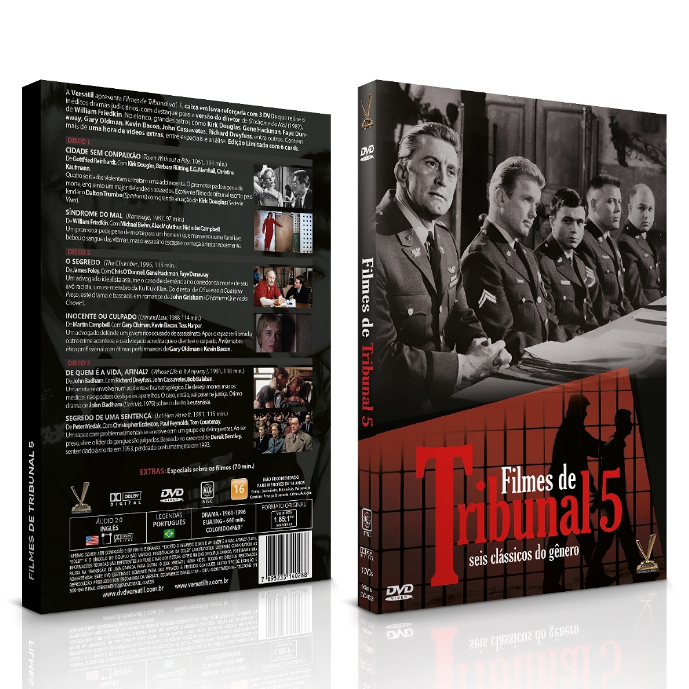 A Versátil apresenta FILMES DE TRIBUNAL VOL. 5, caixa em luva reforçada com 3 DVDs que reúne 6 inéditos dramas judiciários, com destaque para a versão do diretor de “Síndrome do Mal” (1987), de William Friedkin (“Viver e Morrer em L.A.”, “Parceiros da Noite”, “O Exorcista”). No elenco, grandes astros como Kirk Douglas (“Glória Feita de Sangue”), Gene Hackman (“A Conversação”), Faye Dunaway (“Rede de Intrigas”), Gary Oldman (“O Profissional”), Kevin Bacon (“Footloose”), John Cassavetes (“Noite de Estreia”), Richard Dreyfuss (“Tubarão”), entre outros. Contém mais de uma hora de vídeos extras, entre especiais e análise. Edição Limitada com 6 cards.