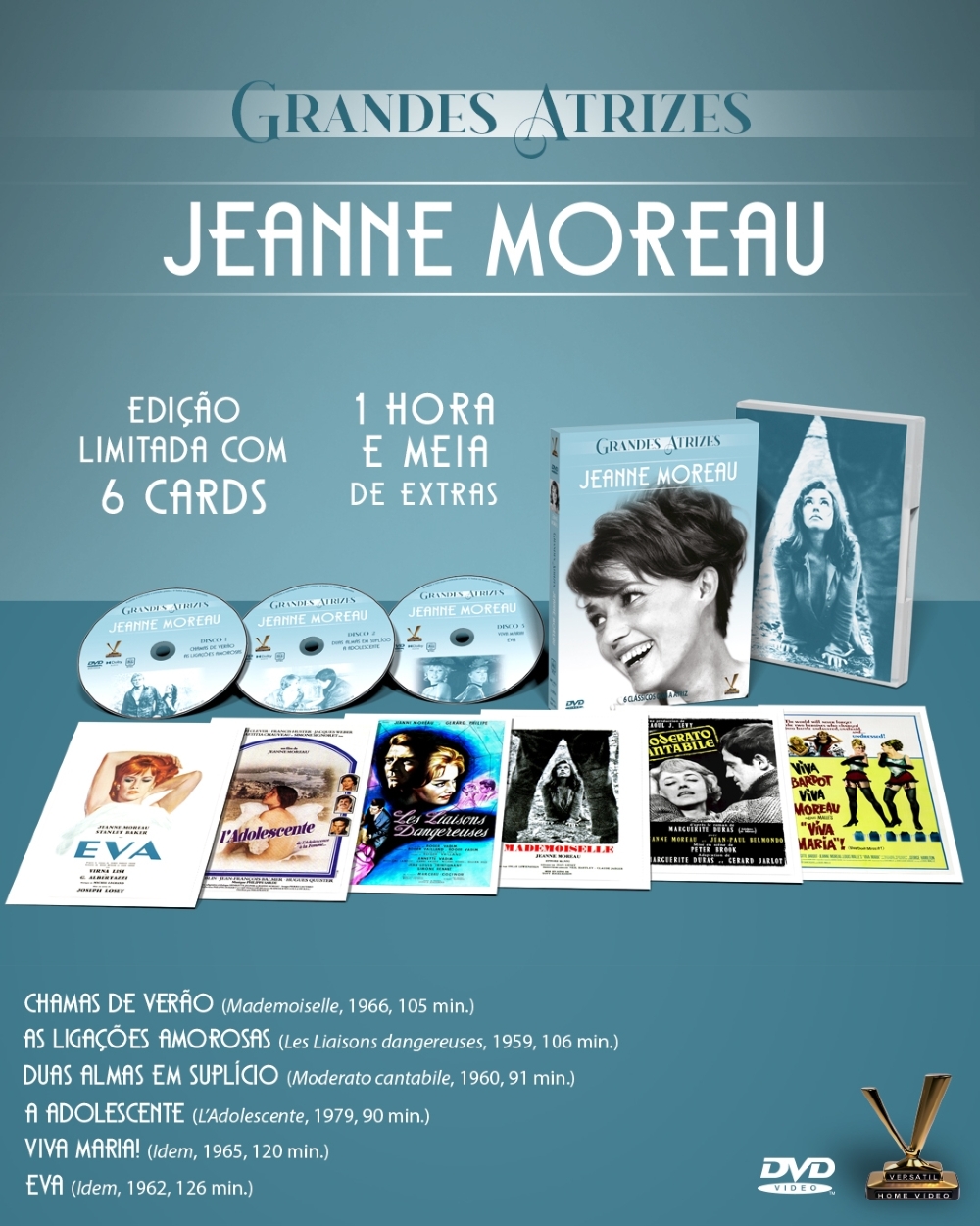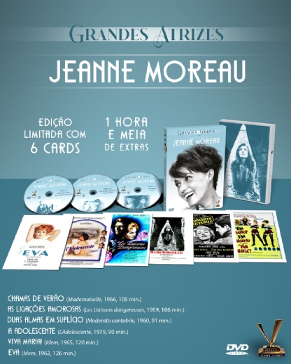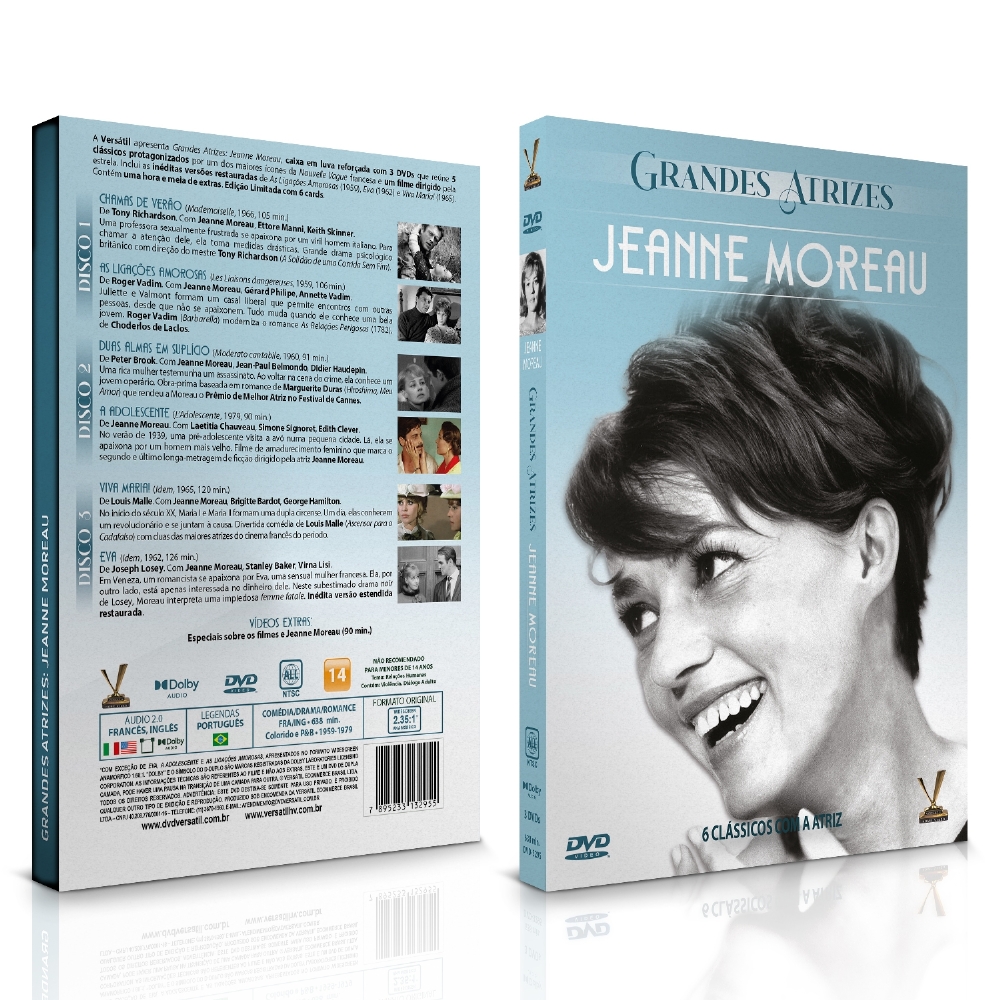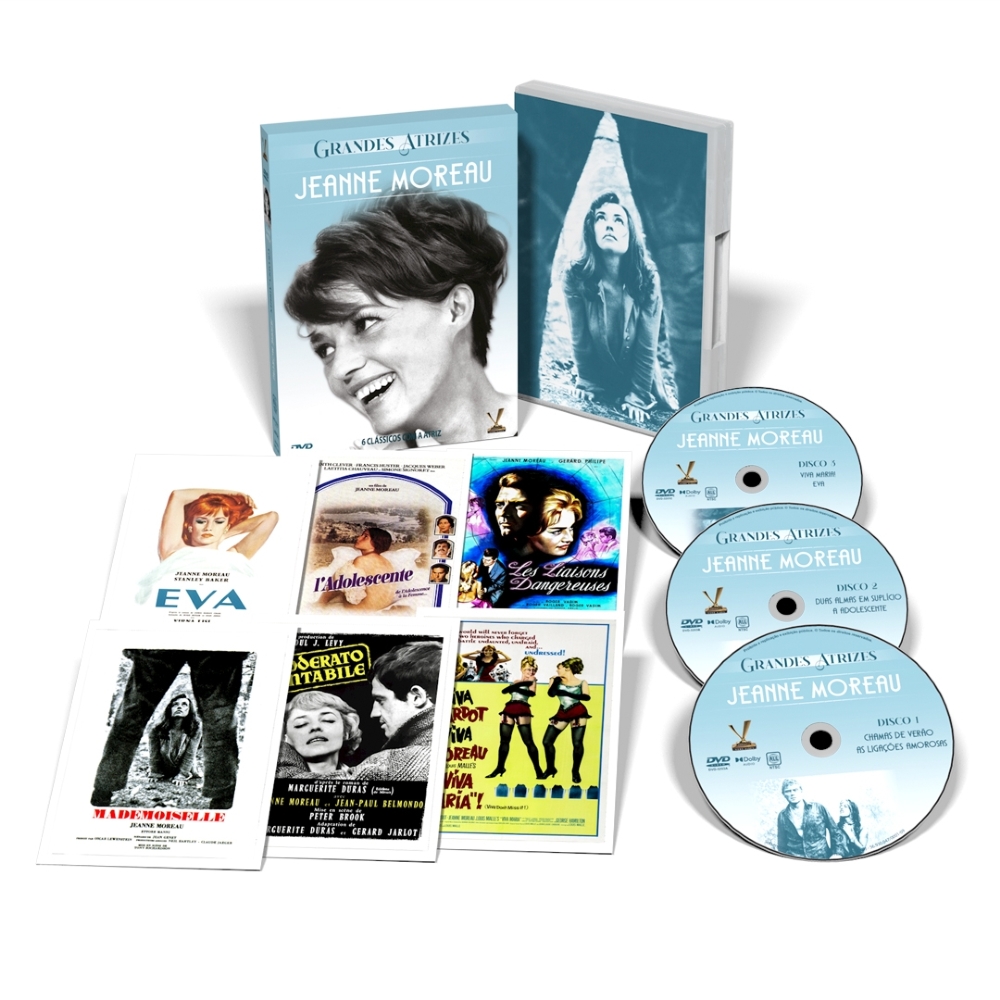 A Versátil apresenta GRANDES ATRIZES: JEANNE MOREAU, caixa em luva reforçada com 3 DVDs que reúne 5 clássicos protagonizados por um dos maiores ícones da Nouvelle Vague francesa e um dos poucos filmes dirigidos pela estrela. Inclui as inéditas versões restauradas de “As Ligações Amorosas” (1959), de Roger Vadim (“E Deus Criou a Mulher”), “Eva” (1962), de Joseph Losey (“O Criado”) e “Viva Maria!” (1965), de Louis Malle (“Adeus, Meninos”). Contém uma hora e meia de extras. Edição Limitada com 6 cards.