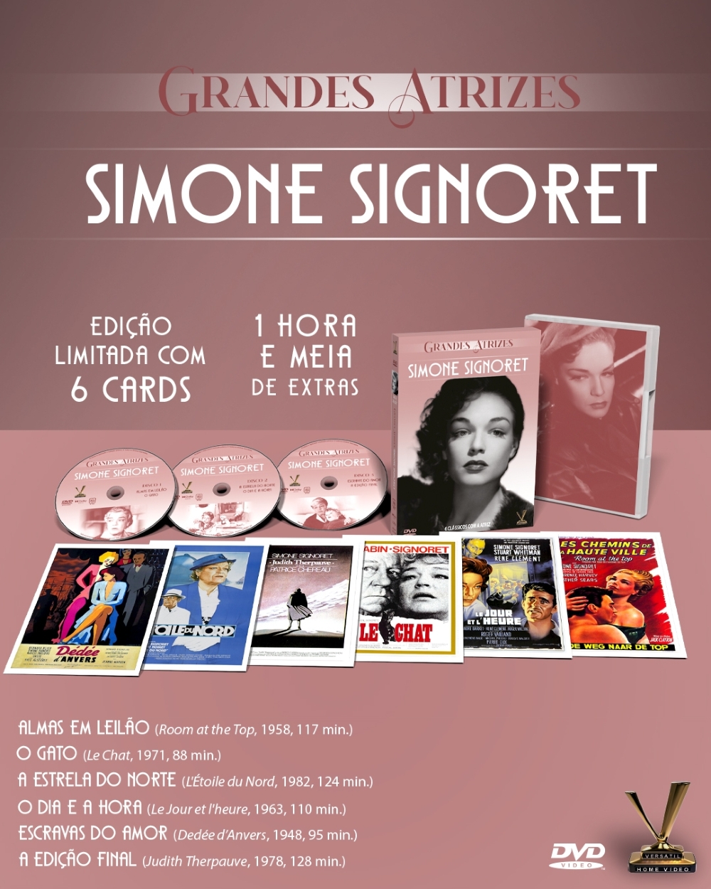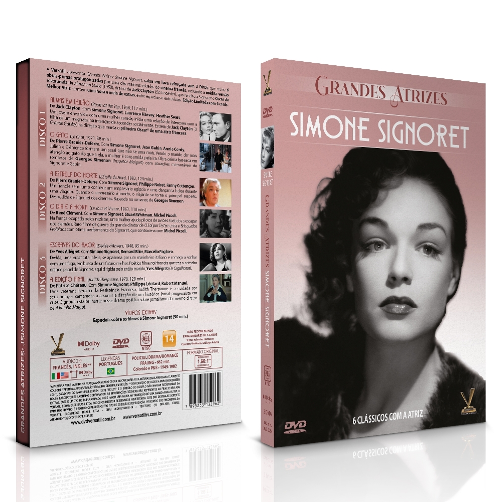 A Versátil apresenta GRANDES ATRIZES: SIMONE SIGNORET, caixa em luva reforçada com 3 DVDs que reúne 6 obras-primas protagonizadas por uma das maiores estrelas do cinema francês, incluindo a inédita versão restaurada de “Almas em Leilão” (1958), drama britânico de Jack Clayton (“Os Inocentes”), que rendeu a Signoret o Oscar de Melhor Atriz. Contém uma hora e meia de extras, entre especiais e entrevistas. Edição Limitada com 6 cards.