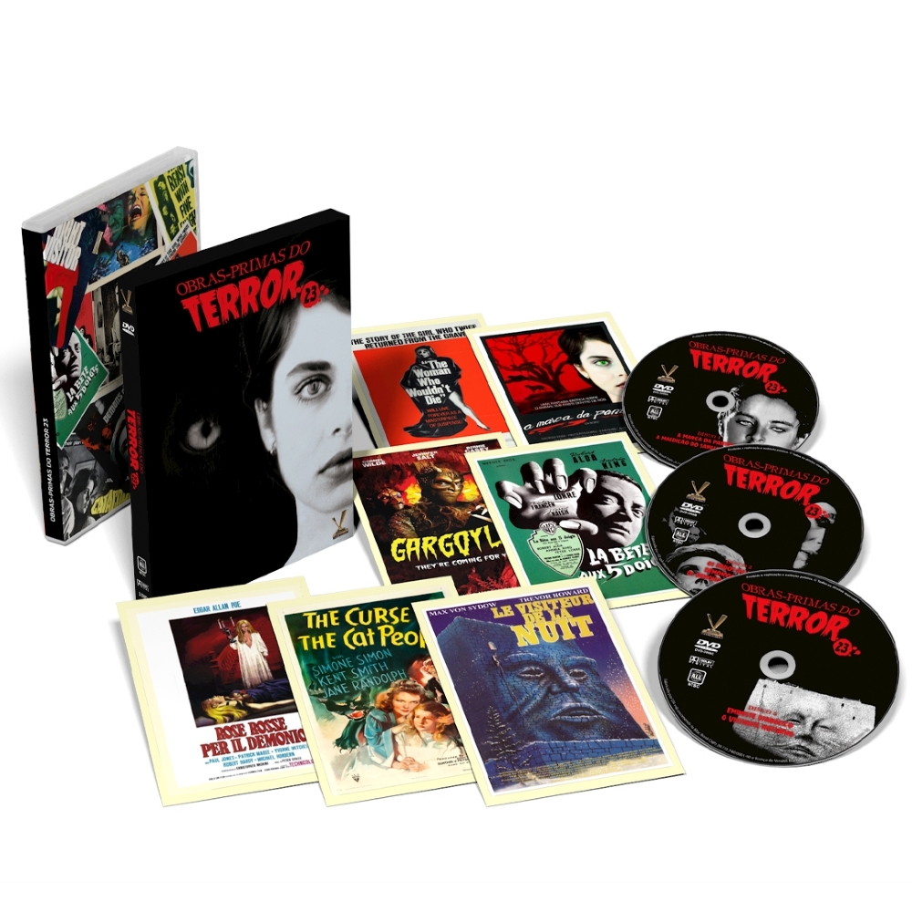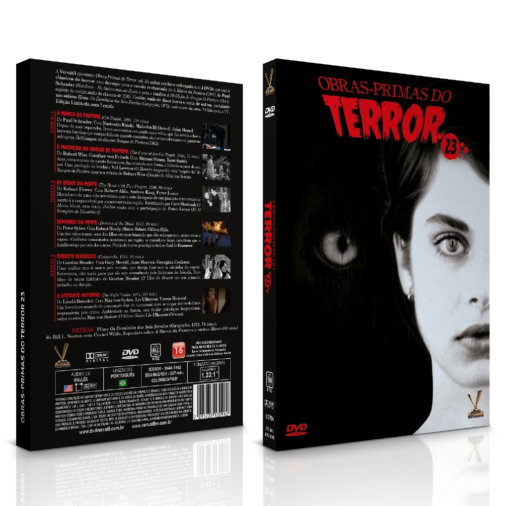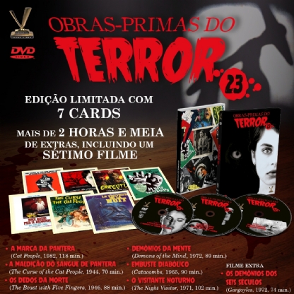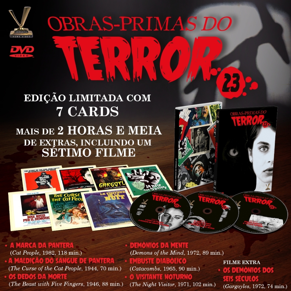 A Versátil apresenta OBRAS-PRIMAS DO TERROR vol. 23, caixa em luva reforçada com 3 DVDs que traz 6 clássicos do horror, com destaque para a versão recentemente restaurada de “A Marca da Pantera” (1982), de Paul Schrader (“Hardcore – No Submundo do Sexo”, “Vivendo na Corda Bamba”), e para o inédito “A Maldição do Sangue de Pantera” (1944), espécie de continuação do clássico de 1942 (“Sangue de Pantera”, de Jacques Tourneur). Contém mais de duas horas e meia de extras, incluindo um sétimo filme: “Os Demônios dos Seis Séculos” (“Gargoyles”, 1972, 74 min.), de Bill Norton, cult-movie dos anos 70 feito para a TV que traz no elenco o astro Cornel Wilde (“Império do Crime”). Edição Limitada com 7 cards.